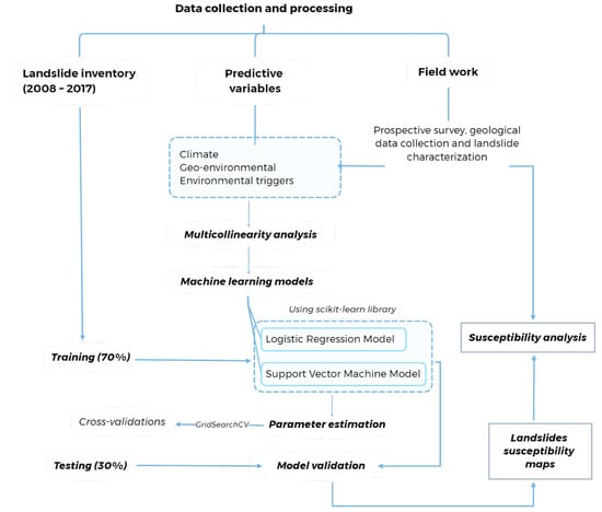 Methodological flow diagram for the evaluation of the susceptibility of landslides in the study area.