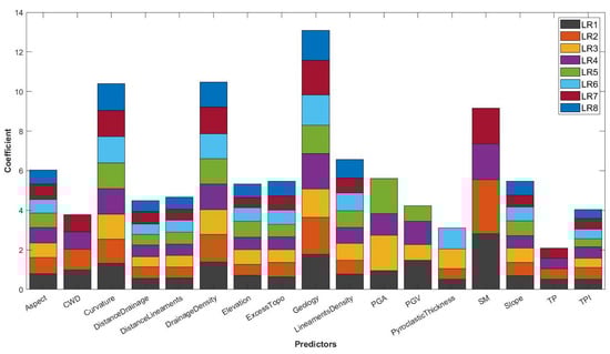 In this work, we implemented seven different configurations (M) to analyze susceptibility sensitivity considering the presence of different estimators. M1—all estimators; M2—all except earthquakes; M3—all except weather; M4—all except eruptions; M5—all except weather–eruptions; M6—all except weather–earthquakes; M7—all except earthquakes–eruptions; M8—all except weather–earthquakes–eruptions.