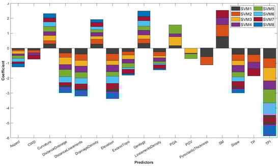 We used 17 predictors to model the spatial susceptibility of the landslides that occurred between 2008 and 2017. According to the logistic regression model, when we used all the variables (LR1), the most predictive factors were soil moisture, geology, PGV, drainage density and curvature (ordered in decreasing order of importance) (Figure 3). In the case of the SVM model (Figure 4), the variables soil moisture, geology, drainage density, PGA and curvature were positively related to the susceptibility to landslide and showed greater importance in the prediction. By contrast, the remaining variables in the SVM model negatively influenced the probability of landslides. We observed that, in general, the variables thickness of pyroclastic deposits, TP, distance to drainage, distance to lineaments and elevation showed the lowest prediction coefficients for both the LR and SVM models. In this sense, it can be stated that the order of importance of the variables (without considering the value of the coefficient) is quite similar in the two models. We observed that, when climatic variables were not included, PGA became the most critical predictor in both models (LR3, LR5, SVM3 and SVM5). In general, the weight of the topographic, geological and hydrological variables did not present significant changes among the different configurations, which may be an indicator of the relatively constant importance of these variables under the experimental conditions developed in the present work.