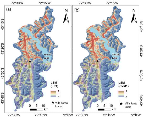 Susceptibility of landslides in the study area: 1 indicates high susceptibility and 0 low susceptibility. (a) Susceptibility map, LR model. (b) Susceptibility map, SVM model.