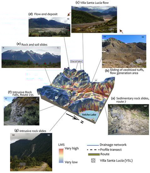 Earthquakes and volcanic eruptions have intensely disturbed the landscape of the Patagonian Andes. In fact, in the last 60 years, the three following significant earthquakes have occurred: Valdivia, 9.5 Mw [1]; Chiloé, 7.6 Mw [2]; and Aysén, 6.2 Mw [3]. The Patagonian Andes were also the epicenter of one of the most explosive volcanic eruptions of modern times. In 2008, the Chaitén volcano spread pyroclastic material over a large area on a continental level [4]. However, in recent years, the glacial and periglacial relief of the Patagonian Andes has also been changing at an accelerated pace due to climate-induced changes [5]. The interaction of these processes has generated a growing landslide activity that has impacted communities and ecosystems in northern Patagonia, Chile [3,6,7,8]. In the Province of Palena, the National Geology and Mining Service (SERNAGEOMIN) identified a total of 2533 landslides [9]. Morales et al. [7] identified 722 landslides in the last 19 years. These geomorphological processes have demonstrated their destructive capacity. For example, on 16 December 2017, a landslide of volcanoclastic rocks generated debris and mudflows, destroying 3 km of the southern highway (Route 7) and 50% of the town of Villa Santa Lucia, causing the deaths of 22 people [6,9].