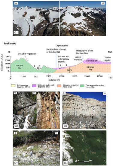 Profile of the study area (see profile trace in Figure 5), where the geomorphological and lithological conditions of the terrain in the different zones are highlighted. Vertical exaggeration x1.5 in AA’. (a) Yelcho Volcanic Cord, composed of tuffs with zeolites partially covered by the Yelcho Glacier; the number 1 indicates the position of these rocks in the profile. (b) Intrusive rocks are affected by faults and joints. (c) The sequence of sedimentary deposits in the Burritos River valley. (d) The sequence of alluvial deposits in the eastern cordon. (e) Satellite image (Google Earth, 2013) of the western cordon north of Villa Santa Lucia, including the Burritos River valley; areas with wetlands can be observed.