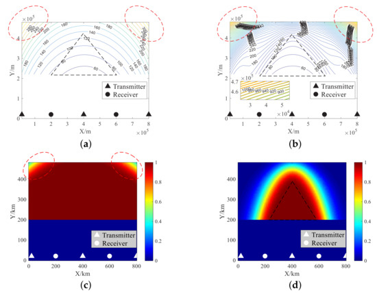 Other node placement schemes and the corresponding GDOP-UM. (a) Placement in line with a short baseline. (b) Placement in an arc. (c) Placement in different regions for transmitters and receivers (transmitters are close to the RMA). (d) Placement in different regions for transmitters and receivers (receivers are close to the RMA).