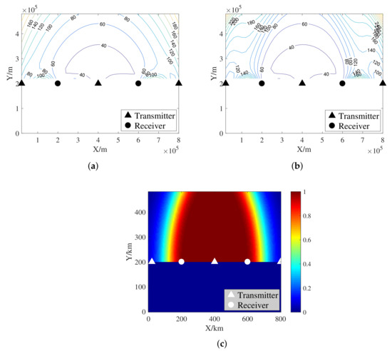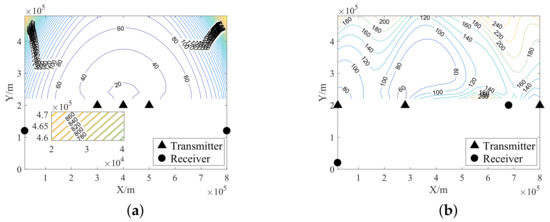 We found that when the transmitters are placed far from the RMA as shown in Figure 7d, compared to the placement scheme as shown in Figure 7c, the electromagnetic energy density in the RMA is significantly reduced while maintaining similar localization performance. Hence, better LPI performance can be obtained [42]. How to ascertain a node placement scheme to obtain optimal localization performance with good LPI performance is also an important and meaningful issue to be studied; however, this is not the focus of this paper.
