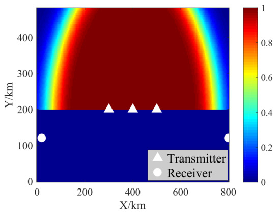 Figure 8 shows the simulation results of the probability of CD for the node placement optimization result, with the T-GDOP as the optimization metric. As we mentioned before, due to the neglect of measurement uncertainty, the T-GDOP metric mainly depends on the relative angles between the target and the radar nodes but is not sensitive to relative distances. Hence, we see from Figure 8 that the receivers are placed far away from the RMA to obtain proper relative angles.