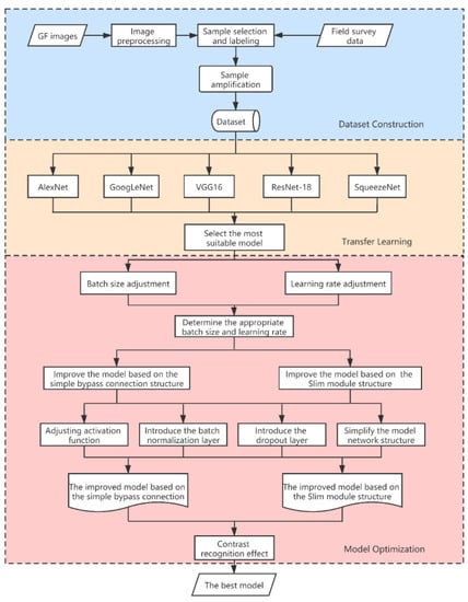 To build a deep learning model that is suitable for remote sensing image classification of pine wood nematode disease, we mainly go through three steps: dataset construction, transfer learning, and model optimization (Figure 2).