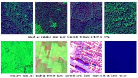 The samples are labelled according to their visual interpretation features. ENVI is used for precise positioning and cutting of the samples. The uniform sample size is 200 × 200 × 3 pixels, and all of the sample images are in TIFF/GeoTIFF format. After classification and labelling of each image, the labelled samples are divided into positive samples and negative samples. Positive samples represent woodlands infected with pine wood nematode disease and provide a direct reference for the identification and classification of research targets. They were generated from images obtained during the period of onset of pine wood nematode disease (2015–2017) in the study area. The negative samples present a collection of noninfectious surface features, including healthy forestland, agricultural land, construction land, and water (Figure 3).