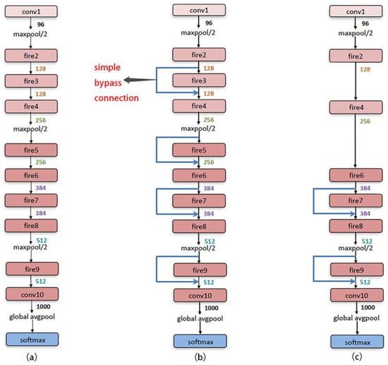 (a) SqueezeNet [27]; (b) SqueezeNet with simple bypass; (c) the improved model based on simple bypass connections.