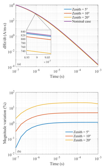 Our first modeling example concerned a typical central-loop ATEM configuration with a transmitter moment of about 531 A∙m2 and a step-off waveform (Figure 3a). The circular transmitter was approximated by 40 electric dipoles. The zenith angle of the frame varied from 5° to 20°, and the azimuth angle was set to 90°. The flight height was set to 10 m. We compared our accurate modeling with the common practice of simulation using the analytical formula of the central loop configuration for the vertical magnetic field, assuming that the transmitter was a standard circle and was perfectly leveled (the zenith angle is 0°). Figure 4 presents the responses over a 0.01 S/m half-space. If actual survey geometry is not modeled, the magnitude of data can be reduced by 0.03~11%. Figure 4b also demonstrates that a larger zenith angle, corresponding to a more seriously tilted frame, results in a more pronounced mismatch between the magnitudes of the actual case and the nominal situation. We also found that the discrepancy is most significant in the range of commonly measured time channels, and the late-time responses are more affected.