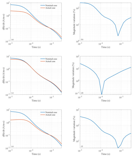 dHz/dt responses of the nominal situation and the actual geometry over a three-layered earth model. (a) crooked transmitter only, (c) tilted receiver only, and (e) both crooked transmitter and tilted receiver. (b,d,f) show the mismatch in the magnitude for (a,c,e), respectively.