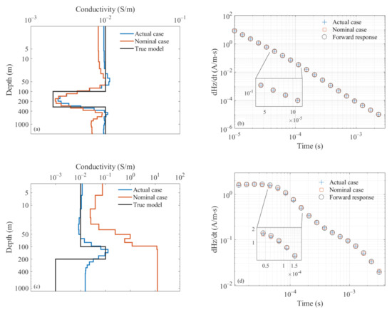 The effect of inexact geometry on the inversion results. (a,b) ATEM: tilted central-loop configuration; (c,d) SATEM: crooked grounded long wire and tilted receiver coil. Detailed survey parameters are presented in Section 3.