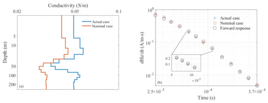 dHz/dt response to ATEM survey (central loop configuration) over a half-space with a conductivity of 0.01 S/m. (a) dHz/dt response to the nominal situation and the actual cases where the inexact geometry is considered. (b) mismatch in the magnitude between the nominal situation and the actual cases.