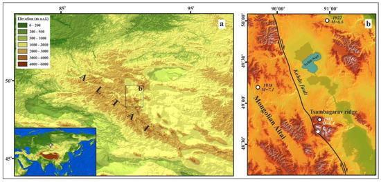 The Mongolian Altai is located in the seismically active Central Asian collision belt and is repeatedly affected by strong earthquakes. Only in the 20th century were there more than 60 earthquakes here with a magnitude of M > 5.5 and an intensity from VII to XI-XII points according to MSK-64 and MSK-78 scales. Several seismic events were accompanied by large disturbances of the earth’s surface, and strong earthquakes with M > 8 (Bolnaysk in 1905, Fuyun in 1931 and Gobi–Altai in 1957) induced surface faulting up to several hundred kilometers [18]. Active faults determine the seismic regime of Mongolia [19,20,21], including areas of the neotectonics uplift in the west of the country—the Mongolian Altai, which is a part of the Altai mountain system, located on the territory of Russia, Mongolia, Kazakhstan and China.