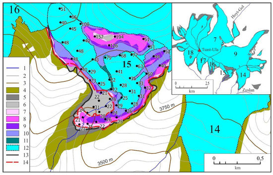 Reduction of glacier No. 15 in the Tsambagarav ridge as a result of the 1988 earthquake according to remote sensing data. 1: rivers (nameless right tributaries of Zuslan river.); 2, 3: elevation lines: 2—every 50 m, 3—every 250 m; 4: glacier at the maximum of the Little Ice Age (LIA); 5–11: areas of glacier reduction based on the results of space imagery interpretation in the periods: 5—from 11 August 1968 to 22 June 1988, 6—from 22 June 1988 to 3 August 1989, 7—from 3 August 1989 to, 14 July 1996, 8—from 14 July 1996 to 14 July 2002, 9—from 14 July 2002 to 26 July 2006, 10—from 26 July 2006 to 15 August 2015, 11—from 15 August 2015 to 2 August 2019; 12: glacier as of 2 August 2019; 13: the boundary of the glacier shortly before the Tsambagarav earthquake (22 June 1988); 14: the boundary of the glacier after the Tsambagarav earthquake (8 March 1989). Dots with numbers indicate glacier thickness (m) according to the GlabTop model. Elevation lines were drawn based on the SRTM 3 digital elevation model (NASA Version 3.0 SRTM Global 1 arc second). The inset shows the reduction of the glacial complex of the Tsast-Ula peak since 1968.