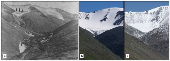 Documentary evidence of the glacier No. 15 reduction as a result of the Tsambagarav earthquake. “Damaged” glacier just after 1988 event (photo Avdeev [16]) (a), arrows show the detachment wall of ice block in glacier tongue; (b,c) views of glacier 16 years (20 July 2004) and 31 years (30 August 2019) after the 1988 seismic event (photo Agatova).