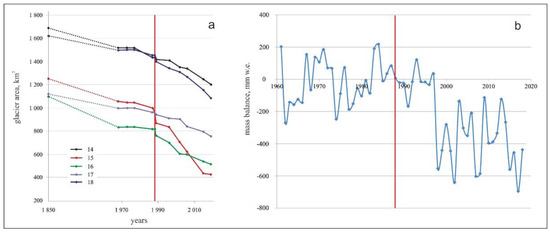 Changes in area of glaciers (No. 14–18) on the south slope of the Tsambagarav ridge and fluctuation of mass balance of glacier No. 15 before and after the 1988 Tsambagarav earthquake. (a) Change in the glacier area from the maximum of the Little Ice Age to 2019 according to the interpretation of satellite images; (b) fluctuations in the glacier mass balance at the height of the equilibrium line as of 1988 (3900 m a.s.l.) for the period 1961–2019. The red line indicates the 1988 Tsambagarav earthquake.