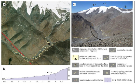 Route of the ice–rock avalanche in the Zuslan valley: (a) traces of the ice–rock avalanche in the topography, (b) longitudinal profile of the avalanche path and (c) view of the upper part of the valley, where ice–rock avalanche jumped over the watershed in the place of the steep (about 90°) bend of the valley. The basis of the scheme is the World-View-2 satellite image; image acquisition date: 19 August 2015. Numbers indicate glaciers discussed in text.