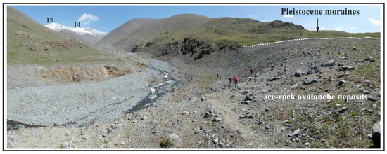 Ice–rock avalanche deposits above the Pleistocene moraine on the left slope and on the bottom of Zuslan valley at the intersection of the Kobdo fault. People in the middle provide a scale (2019, photo: Agatova). Numbers indicate glaciers discussed in text.