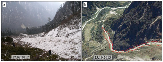 Observations in 2004 and 2019 showed that the melting of the main volume of ice and the projection of the rocky sediments occurred before 2004; however, even 16 years after the event, buried ice was partially preserved in the upper part of the valley, completely degrading by 2019. Long duration of ice melting outside the nival–glacial zone was controlled by the high content (about half of the volume) of rock debris in the avalanche deposits—the ice was tightly armored. For comparison, according to our field observations in another mountain system of Central Asia, ice melting in the avalanche deposits in the Indian Himalayas occurred in the first years, i.e., an order of magnitude faster. This avalanche was triggered in the upper part of the Teesta river basin by the Sikkim earthquake (M = 6.9) on 18 September 2011. The avalanche was smaller and contained minor amounts of rock debris. During our observation in February 2012, it had not yet started to melt, but already in the 23 October 2013 satellite images (Google Earth database), only the cut lower parts of the slopes and a thin debris cover at the place of its stop indicated the recent path of the avalanche (Figure 11).