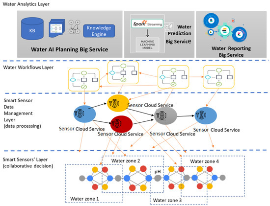 - Smart sensors layer: This layer is based on a sensor-cloud architecture that transforms the water environment into a set of smart and self-monitored water zones. This layer utilizes well-known computing paradigms, such as autonomic computing, sensor networks, and reinforcement learning. The synergy between these technologies will endow the sensors at each water zone with autonomic and analytics capabilities that will offer an intelligent control of water zones’ states.