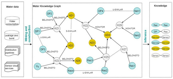 The first step towards intelligent monitoring of water zones is the correct representation of its related information. Given the complexity, heterogeneity, and large-scale nature of the water network, which requires multi-relational and semantic modeling of its elements, the present approach exploits the strengths of knowledge graphs [37] as a recent Google technology to explicitly represent the relationships among smart water environment’s entities (see Figure 3). This new kind of knowledge base was launched, for the first time, in 2012 by Google. Since then, it has been adopted by leading service companies, such as Amazon, Facebook, IBM, Yahoo, etc. These latter’s services (e.g., search, recommendation, advertising, etc.) have been improved thanks to knowledge graphs’ abilities to represent and store complex relationships between real-world entities [37].