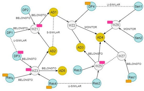 The management operations are triggered when the analysis of water changes after each time period t results in at least one affected water zone. Once the monitoring task is performed, the water state at time is outputted, and the water quality or eventual problems are deduced. The WIN is then updated by considering the new features of each water zone. The updated WIN in Figure 4 shows that the abnormal behaviors are represented by labeled nodes (see red colors) denoting the deviation patterns. That will facilitate and accelerate the selection of corrective plans/actions by adopting a classification of the WIN nodes with similar features/states, as will be demonstrated in the next section.