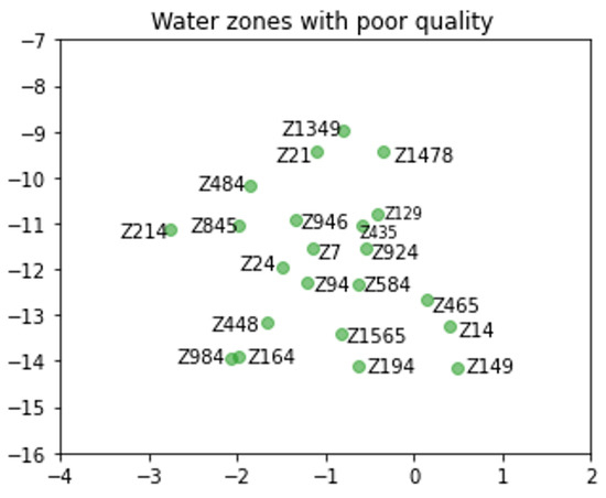 To capture semantic and structural correlations between different zone locations, the proposed SWM-INRL approach is based on metapath2vec, as an incremental embedding technique, as previously mentioned. Figure 7 visualizes the latent vectors learned by metapath2vec model of 1600 water zones. It is clear that the water zones with similar characteristics are classified (see Section 8.2.2) and grouped to each other. They also were separated from other nodes according to the water quality.