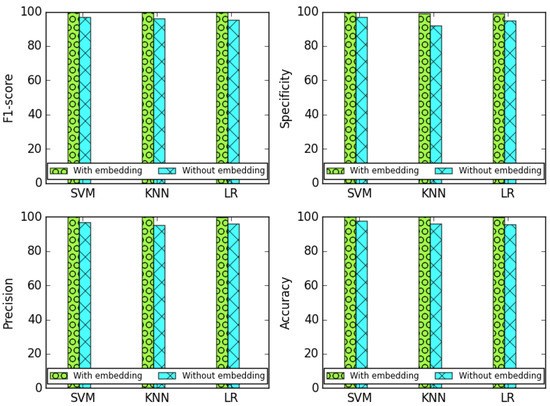 The goal of these test series is to evaluate the ability of the proposed approach to correctly classify the water zones’ entities, which is essential to trigger the appropriate corrective measures. We also leverage the importance of incremental learning in mapping water entities with similar behavior into close vector representations, which facilitates their classification. For this purpose, tests were conducted with three different classifiers (SVM, LR, and KNN). After that, the same tests were repeated without executing the incremental embedding step. For all the compared methods, the number of water entities was set to 1600 and the number of classes, i.e., water quality deviations, to 4. Results are recorded in Figure 12, Table 8 and Table 9.