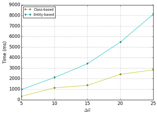 The goal of this test series is to study the time complexity of SWM-INRL by considering the amount of captured changes at each water zone (variation of in [5%, 10%, 15%, 20%, 25%). For each test case, the computation time was recorded at both the water entity level and the water class level. The recorded results in Figure 13 are computed as the sum of incremental embedding time (), the time devoted to exploring the embedding space for the classification purpose (), and the time spent to select a management operation for a water zone’s critical case ().