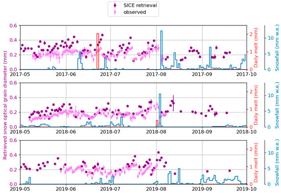 Observed and retrieved snow optical grain diameter () at EastGRIP during May–October 2017–2019. Error bars indicate the daily standard deviation along the 90 m transect for observation and within a 2 km radius for the retrieval. Sonic ranger-derived snowfall and melt rate calculated from the PROMICE EGP AWS data.