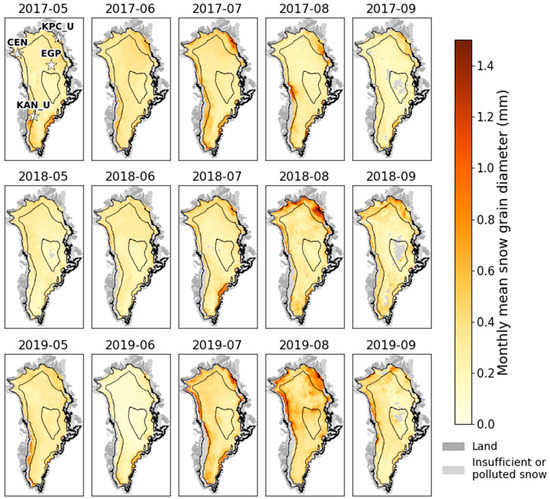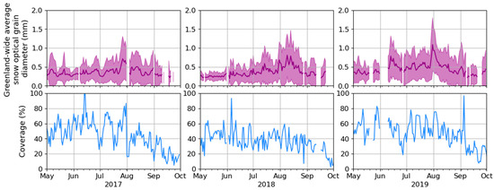 The SICE toolchain provides daily snapshots of optical snow grain diameter at a 1 km resolution. The main challenge for shortwave optical remote sensing is the impossibility of retrieval during cloudy conditions. The average cloud-free coverage was 45% in 2017, 31.8% in 2018 and 40% in 2019 (Figure 2). The ice-sheet-wide snow-covered area-only mean was around 0.3 mm at the beginning of the season and peaked above 0.6 mm around late July or early August, when surface melt is widespread. The smaller standard deviation in May indicates the relative homogeneity of cold, dry snow grains at the surface in the early melt season. As melt starts on the southern and low-lying ice sheet, the standard deviation increases and reaches its maximum synchronously with the average , at the peak of the melt season. The warm year of 2019, during which melt was well above average [88], also had the highest Greenland-wide average : 0.45 mm compared to 0.36 mm for both 2017 and 2018. That year (2019) also has the maximum daily mean value (1.08 mm on 31 July 2019; Figure 2), as compared to a respective maximum of 0.71 mm and 0.81 mm in 2017 and 2018.