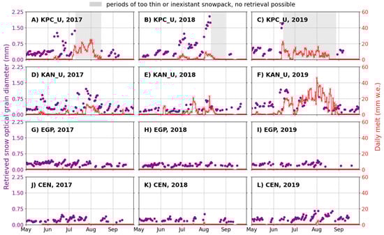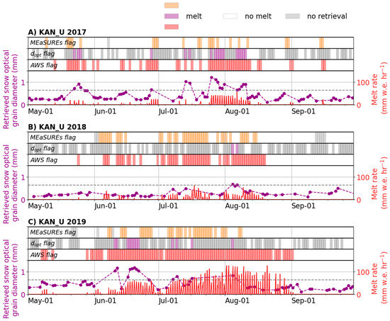 Comparison of three melt flags at KAN_U: (i) from MEaSUREs dataset; (ii) derived from a 0.64 mm threshold on the retrieved snow optical grain diameter (); and (iii) derived from the energy budget at the KAN_U AWS. The melting/nonmelting binary flag is shown in the upper part of each panel while retrieved snow optical grain diameter (purple dots), its 0.64 mm threshold value (dashed gray line) and the hourly AWS-derived melt (red line) are shown in the lower part of each panel.