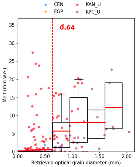 Daily melt calculated at the PROMICE AWSs and the retrieved snow optical grain diameter. Boxplots present statistics for 0.32 mm wide bins of optical grain diameter. The optical grain diameter threshold for melt detection is the dashed red line. In each boxplot, the whiskers represent the 5th and 95th percentiles, the edge of the box the 25th and 75th percentile and the solid red line represents the mean.
