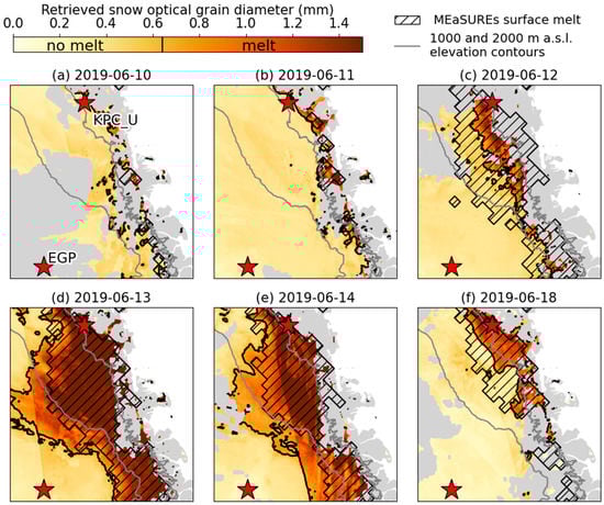 Optical snow grain diameter retrieval and associated surface melt flag (areas within the black line) and MEaSUREs melt flag for a 10–18 June 2019 heat wave in Northeast Greenland along with AWS locations (red stars) and elevation contours (gray lines, 1000 and 2000 m a.s.l.).