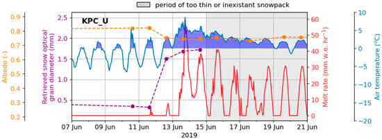 Retrieved snow grain optical diameter, plane broadband albedo, melt and air temperature at KPC_U AWS during the Northeast Greenland heat wave of June 2019.