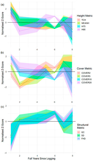 The maps of percentage change in LiDAR-derived metrics were generated using the raster package in R [68] and the software QGIS [69]. To produce graphs of temporal dynamics for each metric, we calculated the number of complete years since logging which was then subsequently used as the variable expressing the temporal dimension. Since metrics were expressed in different units and had disparate variances, we used normalised z-scores to fairly compare the changes observed at different metrics. The normalised z-scores of each metric were plotted against the years since logging using the R package ggplot2 [70], showing the mean of all the corresponding 50 × 50 m cells of the grid along with ribbons showing their 95% confidence intervals.