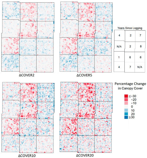 The maps of percentage change in LiDAR-derived cover metrics (Figure 5—ΔCOVER2, ΔCOVER5, ΔCOVER10, and ΔCOVER20) clearly identify the regions that were logged in 2012 and 2013 (significant decreases, p < 0.01). In blocks from earlier logging activities (2006–2010), ΔCOVER2, ΔCOVER5, and ΔCOVER10 highlight different stages of regrowth (significant increases, p < 0.01). On the other hand, this regrowth cannot be identified from ΔCOVER20 (non-significant increase, p > 0.05).