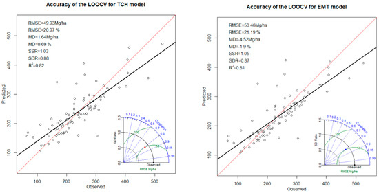 Graphs of Comparison of predicted vs observed AGB in Mg/ha for the LOOCV of the TCH and EMT models with inset statistical analysis results and a Taylor diagram representing how well the models’ predictions reflect the observed data in terms of the ratio of their standard deviations, the correlation of the data, and the RMSE.