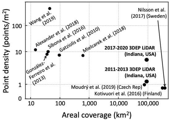 LiDAR has been used to map a continuous three-dimensional (3D) structure of the forestland [7] and biomass estimations [8]. With greater point densities than spaceborne LiDAR and broader areal coverage than ground-based LiDAR, airborne LiDAR has been widely used to measure tree height for forest inventory applications [9,10,11,12,13,14]. Figure 1 shows areal coverage and LiDAR point density of previous forest application research. Previous studies demonstrated that airborne LiDAR could provide a high accuracy height measure with an R2 over 0.9 [15,16] and low measurement error within 1.12 ± 0.56 m from an actual height [10,17]. A similar level of accuracy was observed when LiDAR-based height measurement was applied to deciduous and conifer trees when LiDAR density was above 7 points/m2 [3]. However, the accuracy of LiDAR-based height measurement was shown to decrease when LiDAR point density is reduced below 2 points/m2 [18].