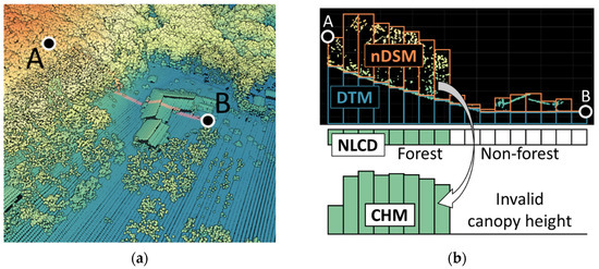 A subset of (a) 3D Elevation Program (3DEP) LiDAR data from Martell Forest in Indiana, USA with (b) a 2D slice of point cloud along the transect from point A to B showing the canopy height model (CHM) generation procedure. nDSM: normalized digital surface model, DTM: digital terrain model, NLCD: National Land Cover Database-based binary classification map of forested and non-forested areas, and CHM: canopy height model.