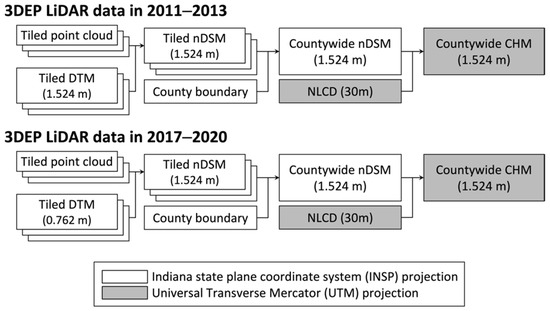 Tiled nDSM data were combined to generate a countywide CHM (Figure 5). All nDSM tiles with 1.524 m spatial resolution in a county were merged and clipped by the county boundary polygon. Normalized height in non-forestland was changed to the invalid value using the 2013 and 2019 National Land Cover Database (NLCD)-derived forested and non-forested classification map [29]. A temporary upscaled NLCD land cover map was generated to match the spatial resolution of the input nDSM with a nearest neighbor sampling method. We used a common spatial reference system for the CHM data products with the Universal Transverse Mercator (UTM) coordinate system (zone 16N) for the output CHMs. The entire CHM generation process was implemented using the Geospatial Data Abstraction Library (GDAL) package with Python programming language.