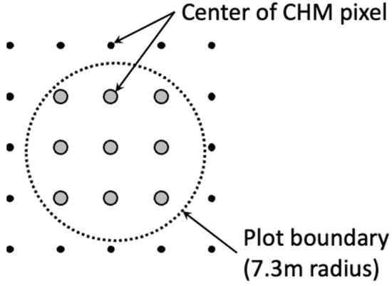 Extraction of plot-level maximum tree height using canopy height model (CHM). The maximum canopy height was derived by searching inside a continuous forest inventory (CFI) plot area (r = 7.32 m).