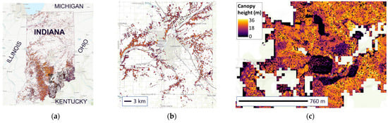 Visualization of (a) canopy height model (CHM) of Indiana, USA, (b) CHM in Tippecanoe County, Indiana, USA, and (c) CHM in Martell Forest in Tippecanoe County, Indiana, USA.