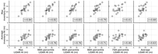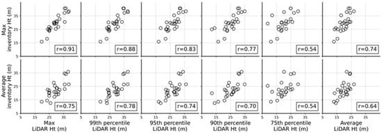 Average inventory height and LiDAR height metrics had less positive correlation coefficients between 0.4–0.8. The ninety-ninth percentile of LiDAR height had the strongest correlation of 0.78 and 0.76. A decreasing trend of correlation coefficients between average inventory height and LiDAR height percentiles was observed as percentile number decreased. Correlation between average LiDAR height and average inventory height was 0.6. We also conducted correlation analysis between median inventory height and LiDAR metrics. However, we do not report the result since the correlation was weaker than the above results.
