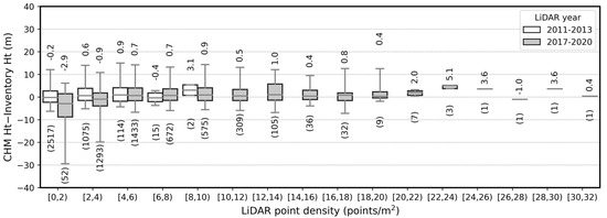 Height measurement error with respect to LiDAR point density. Boundaries of upper and lower whisker are the ninety-seventh and third percentiles. The number above each box plot is median, and the number below box plot is number of data points. CHM: canopy height model; Ht: height.