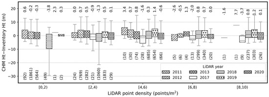 Average and standard deviation of LiDAR density were 1.6 and 1.1 points/m2 for 2011–2013 LiDAR and 6.0 and 3.2 points/m2 for 2017–2020 LiDAR data. Height error in relation to LiDAR point density mostly showed a positively skewed distribution (Figure 11). Median values were in a −3 to 5 m range. However, height error had a negatively skewed distribution for 2017–2020 LiDAR data when LiDAR point density was under 4 points/m2. The third percentile of error distribution was −31 m when point density was 0–2 points/m2 and −20 m when point density was 2–4 points/m2.