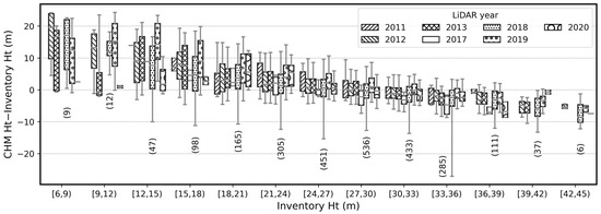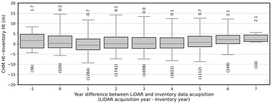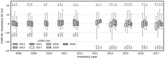 Height measurement error with respect to inventory and LiDAR acquisition year. Boundaries of upper and lower whisker is the ninety-seventh and third percentiles. The number above each box plot is median, and the number below box plot is number of data points. CHM: canopy height model; Ht: height.