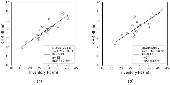 Correlation between LiDAR and inventory height metrics. LiDAR data in 2011–2013 and inventory data in 2008–2012 were used. Forest plots have positional uncertainty approximately less than 0.1 m (n = 25). Ht: height.