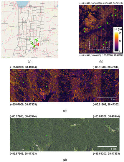 Inventory plots (green dots) with low height measurement accuracy: (a) plots with low height accuracy located in southeastern Indiana; (b) a subset of plots on top of canopy height model (CHM) from 2017–2020 LiDAR data, plots with low height accuracy distributed along the banded regions with a lower LiDAR point density (Figure 12); (c) CHM of dotted area in (b); (d) 2018 National Agriculture Image Program (NAIP) County Mosaic image of dotted area in (b). Ht: height. Note: a majority of inventory plots with an error less than two standard deviations were not displayed for brevity.