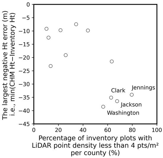An interesting trend was revealed between tree height underestimation and LiDAR point density (Figure 18). It was shown that the magnitude of the largest negative height error was associated with the proportion of inventory plots with LiDAR density between 0–4 points/m2 per county. In other words, counties with higher LiDAR density were less prone to severe height underestimation. It should be noted that the values of the y axis in Figure 18 are minimum values of height measurement error.